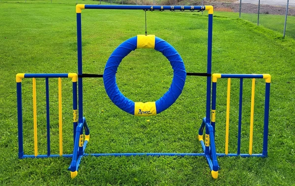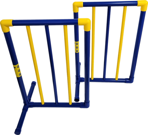 The Activedogs.com Free Standing Wings are part of the “Premium Series” line of agility equipment. Each free standing wing measures 24” wide and 36” tall. The Free Standing Wing frame poles are 1.25” O.D. with narrower center bars. They are blue and yellow in color. These are great wings that can be used on a variety of jumps and obstacles. They are stable, sturdy, and are significant in size. They can be clearly seen by dog and handler. Because of the design they are very easy to use and can be placed in a range of ways and positions. They will not be in the way of the jump base feet and can be set close to the openings of many obstacles. You can have fun by decorating them and wrap them with foliage, flowers, etc.