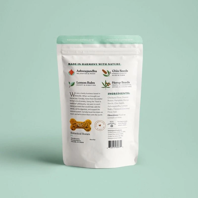 Promotes good vibes! Made to mellow out the more skittish pup. Ashwagandha and lemon balm are known to reduce stress levels and help animals find their inner calm. There’s a lot of zen packed into each and every little bone-shaped peanut butter cookie.