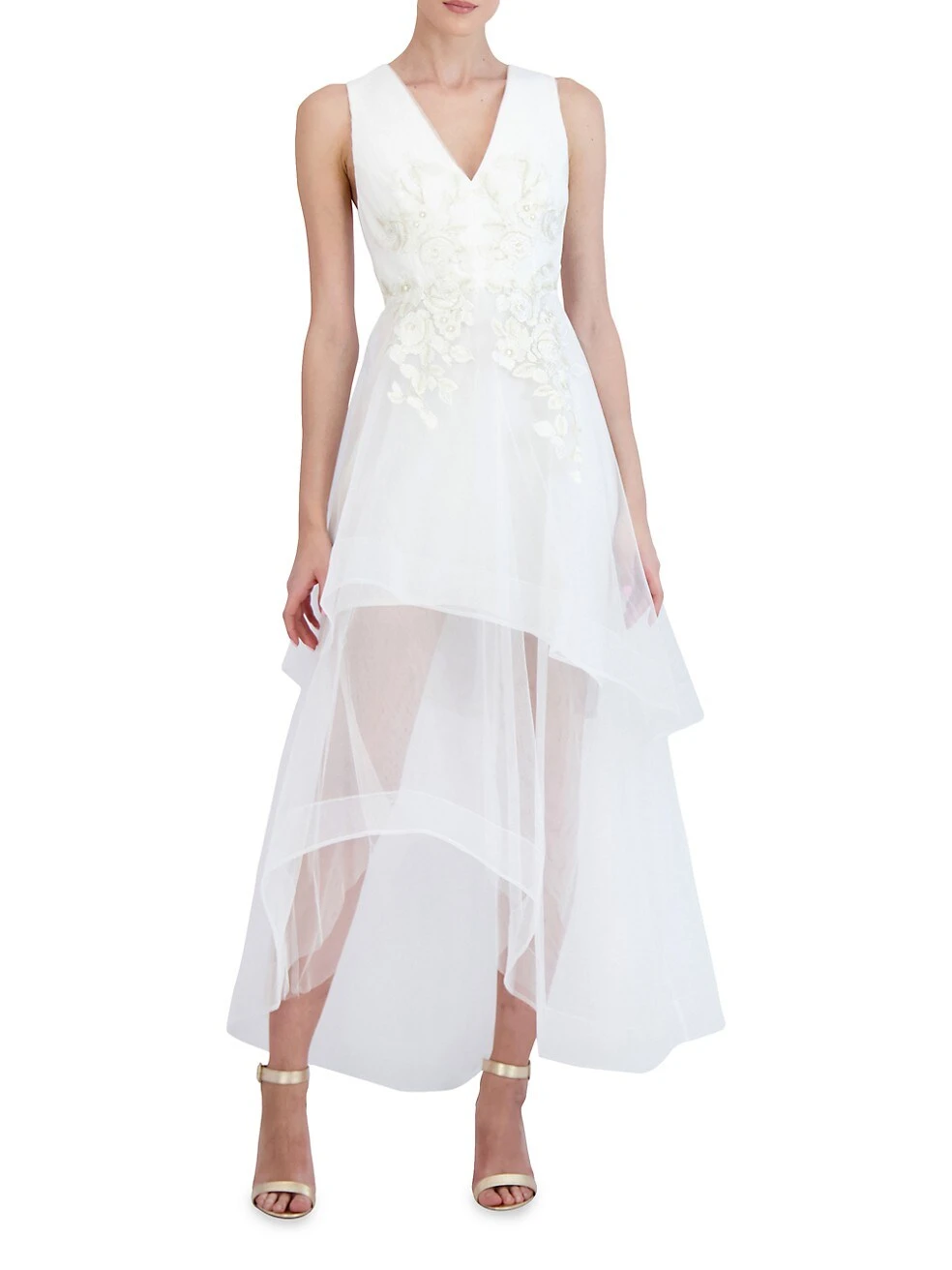 BCBGMAXAZRIA creates high-fashion pieces evoking classic European sophistication with an American twist. Featuring stunning floral embroidery, this gown is finished with an asymmetric skirt.
