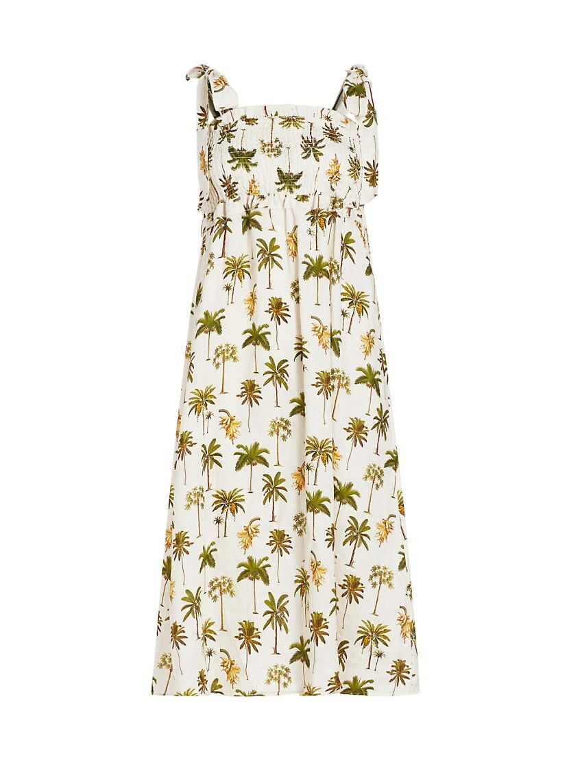 KIVARI’s smocked Bianca dress features adjustable self-tie tank straps and palm tree and banana prints.
