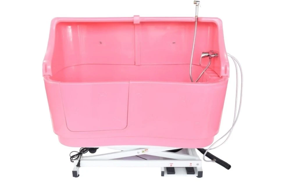 A polyethylene bath in the color pink (art. 1393.1125) including splashback with tap set on an electrically adjustable base with white powder coating. The color in the photo of the outside is a bit light but the bath is a bit darker in real life so more like the inside on the 2nd, 3rd and 4th photo. Handy to operate via electric foot control, this bath goes up and down almost upright. Extremely handy if the bath has to be placed somewhere in between. The chassis goes low to an entry height of 50 cm and can be raised to the ideal working height! Washing the animal at height, without lifting heavy, is therefore no problem. Dimensions outside bath 148 cm long, 80 cm wide. Deep (from edge to bottom) 40cm with intermediate platform for the smaller dogs so that you always work upright.