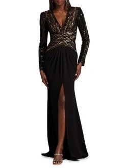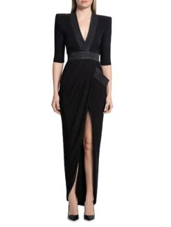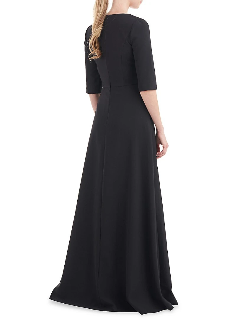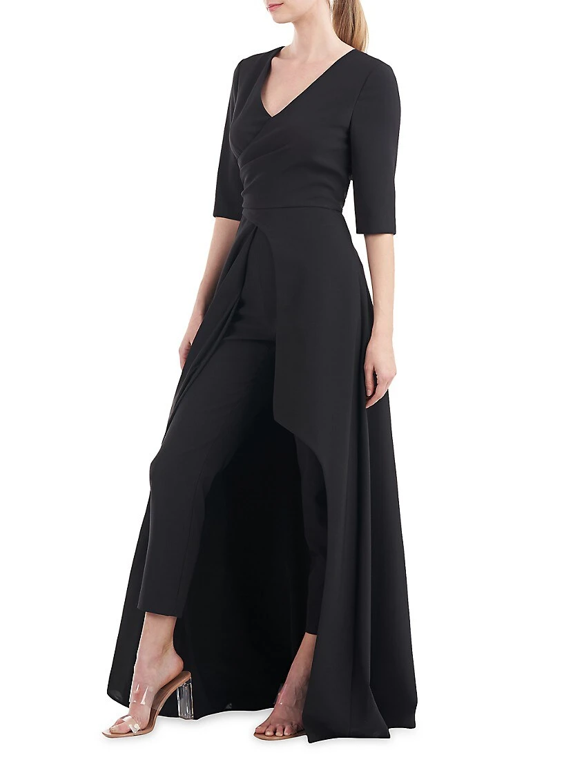 Crafted of stretch-crepe, the Gina gown by Kay Unger is designed in a walk-through style with tailored pant legs layered underneath a floor-length skirt.
