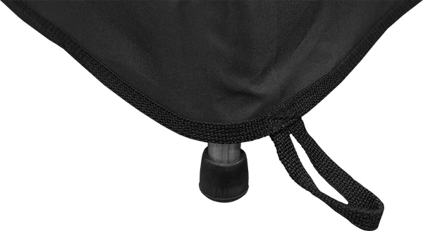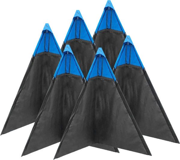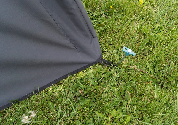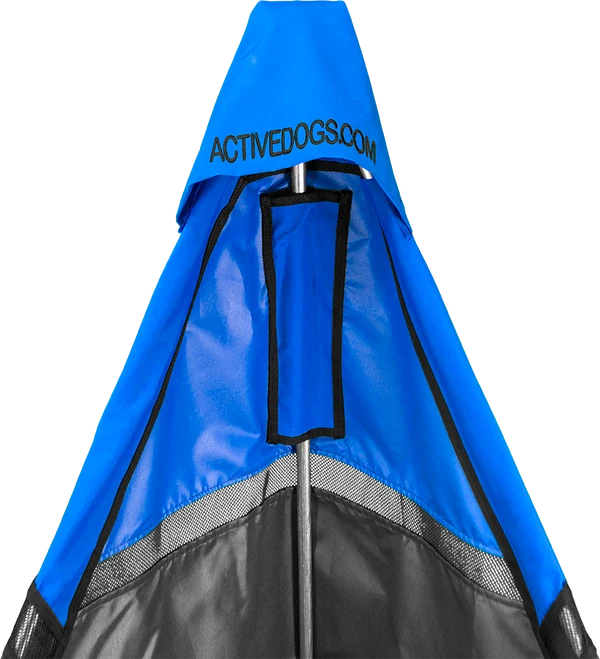 The bottom of the tent and all edges are reinforced and bound. The top of the poles are held together with our locking pin system that easily snaps open should you want to take apart the blind. Our unique blind design features the 4 layer reinforced hood that is on all of our blinds. This blind will never slip down the poles as the reinforced hood holds them in place. This blind is different in the fact that the peep window area extends the full width of the blind. The blind is a beautiful royal blue color on the top section and solid black on the bottom portion of the blind. The blind has a removable spike hold down system. The three spikes come with the blind and have a pouch for storage when the blind is not in use. There are no nasty short spikes welded onto the poles to tear up the inside of your vehicle. The poles also have rubber end caps at the bottom of the poles for working indoors during those winter months or rainy days. This is a nice feature because the blind will stand secure on a hard surface. There is an attached Hook and Loop strap on the side of the blind for holding the blind together in storage.