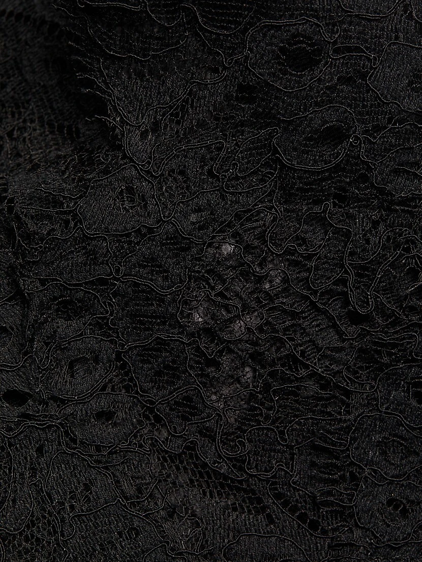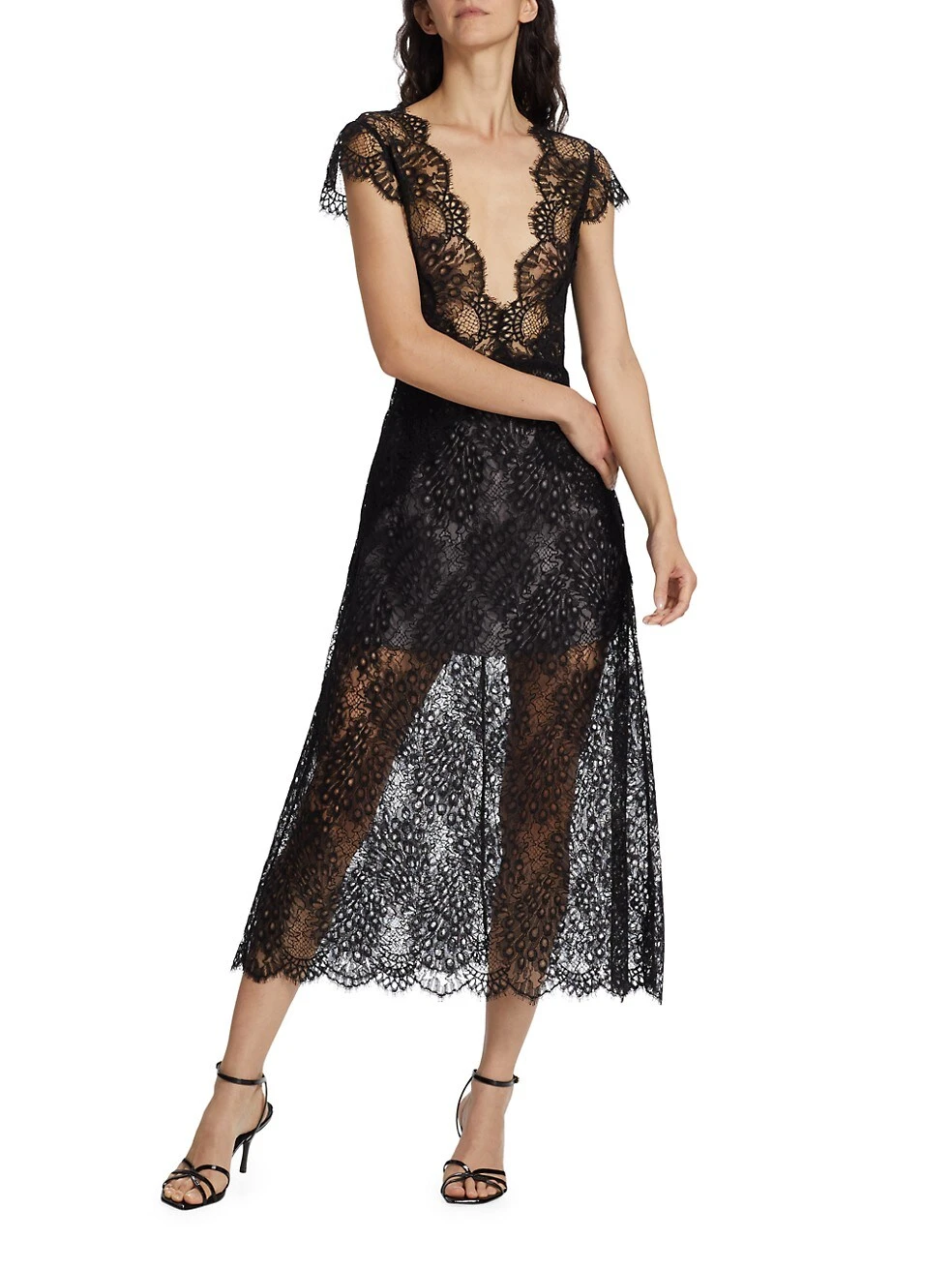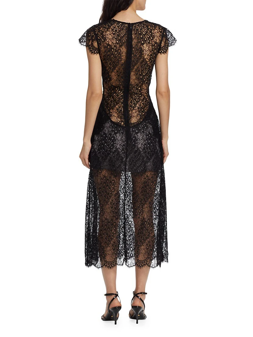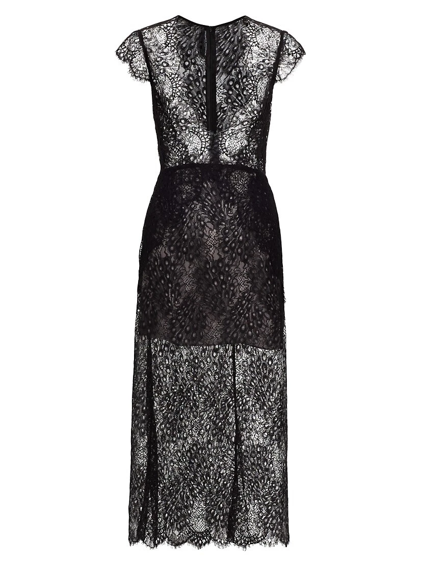 From the Femininity Collection. Crafted of romantic lace, Frederick Anderson’s stunning midi-dress showcases a deep plunging neckline and flirty cap sleeves.