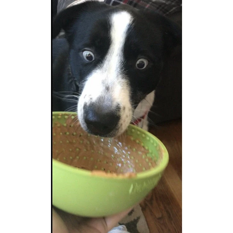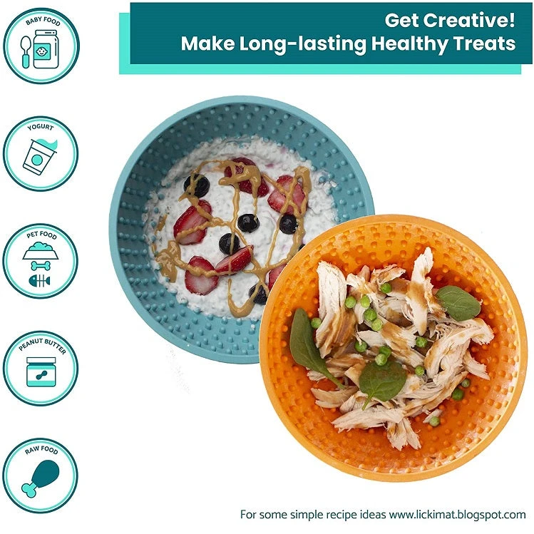 The Lickimat® is simple, yet ingenious in its design. The bumpy texture traps tiny bits of food allowing you to quickly and easily apply soft food and treats your dog will absolutely love. It is both easy to clean and easy to use, making the product a delight for you as well. Try different recipes to find what your dog likes the most. Experiment with foods like peanut butter, yogurt/cottage cheese, softened fish, savory gravy, dog toothpaste, wet dog food, pureed fruit, puppy ice cream.