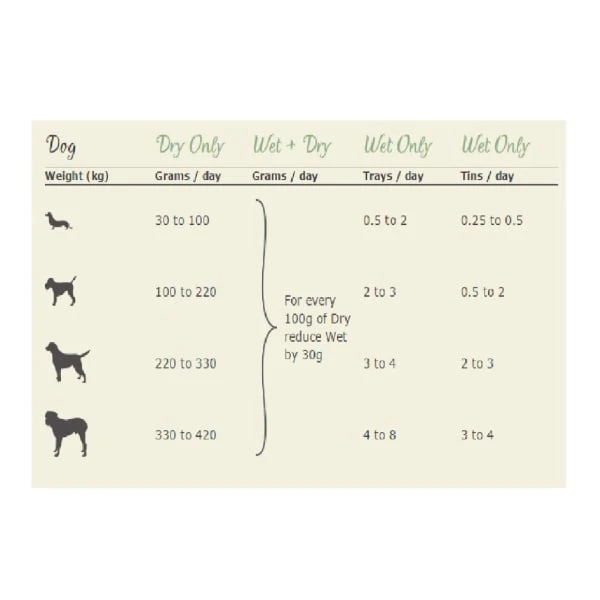 Composition: 65% Freshly Prepared: Venison (40%), Pheasant (15%), Salmon (10%), Organic Potatoes, Butternut Squash, Organic Green Beans, Organic Apples, Vitamins & Minerals, Hemp Oil (Source of Omega 3 & 6). Botanical Herbs: Golden Rod, Nettle, Aniseed, Rosehips, Marigold Petals, Cleavers, Kelp, Alfalfa, Milk Thistle, Dandelion Root, Burdock Root, Celery Seeds.