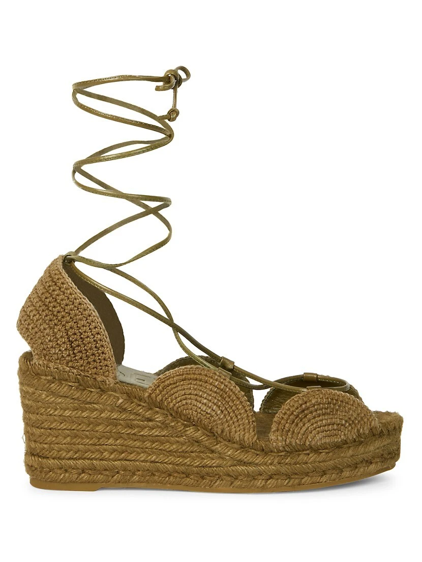 Creative Director Jonathan Anderson captures the carefree aesthetic of island life in his lively collection for LOEWE. Inspired by Paula’s, Armin Heinemann’s legendary Spanish boutique, the design visionary presents original archive prints, dynamic fabrics, and laid-back silhouettes. Crafted of woven jute panels, LOEWE’s Solar espadrilles feature wraparound ankle straps and a jute wedge heel.