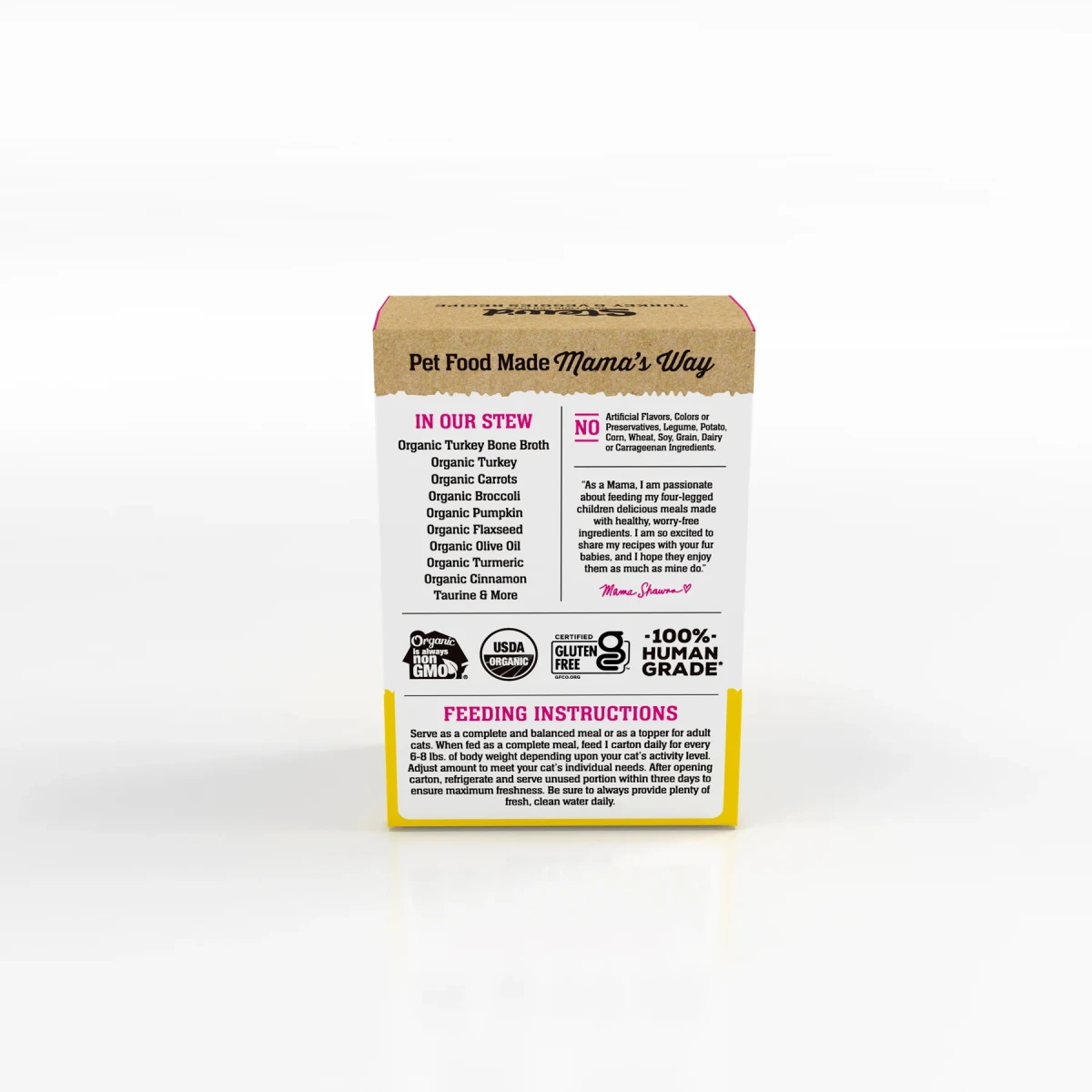 Mama Shawna’s “Stew’d” Turkey & Veggies recipe is a wholesome cat food featuring 100%, Organic, Human-Grade Ingredients. This tasty recipe is stew’d according to FDA human food regulations using the same quality ingredients that we would eat ourselves. Although these stews are intended for your cat to eat (not you), they contain no animal feed grade ingredients and are made in an FDA & USDA Organic Certified inspected facility. So not only can your fur babies taste the Mama Shawna difference, but you can feel great about feeding them this food. As the saying goes, Mama knows best!