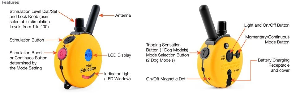 The mini Educator ET-300 is a ½ mile remote trainer loaded with unique features making it the most humane and effective dog training collar available. The ability to set the boost level from 1 to 60 levels allows the user to tailor the boost stimulation to your dog’s temperament. Smaller dogs typically need 1 to 20 while bigger more stubborn dogs require the 20 to 60 boost range. The “lock and set” greatly reduces the chances of over stimulation by allowing the user to lock in a desired stimulation level. The smaller transmitter is especially well-suited for smaller hands or in situations where discreetness is important. But, don’t be fooled by the small receiver size 2”X1.5”X1” 2.4 ounce, it provides plenty of stimulation for most dogs. The unique COS (control of stimulation) technology provides very clean and reliable stimulation without the normal head jerking often found with other training collars. The tapping sensation employed is similar to vibration, but more intense making it a good substitute to the stimulation. The unit can be converted to tone instead of vibration. The stop watch style transmitter is so ergonomic; you don’t even have to look at the remote allowing you to watch your dog. The night tracking light is controlled by the transmitter allowing the user to flash or continuously light up the collar receiver for locating your dog after dark. Lost transmitter beeper can be turned on to help locate a misplaced or lost transmitter. The transmitter even floats so don’t worry if you drop in the lake. Educator Remote E-Collar will turn a smart stubborn dog into a genius. 100% Satisfaction Guaranteed. Proudly Assembled in the USA.