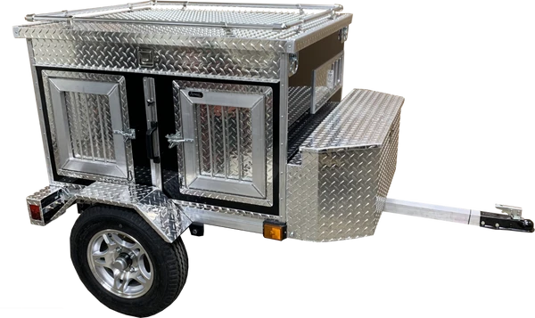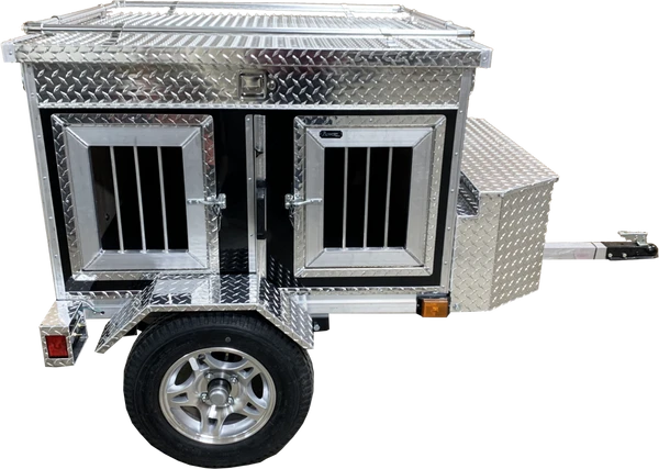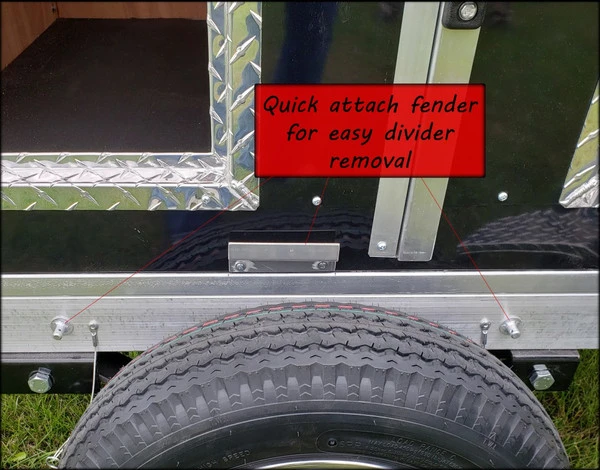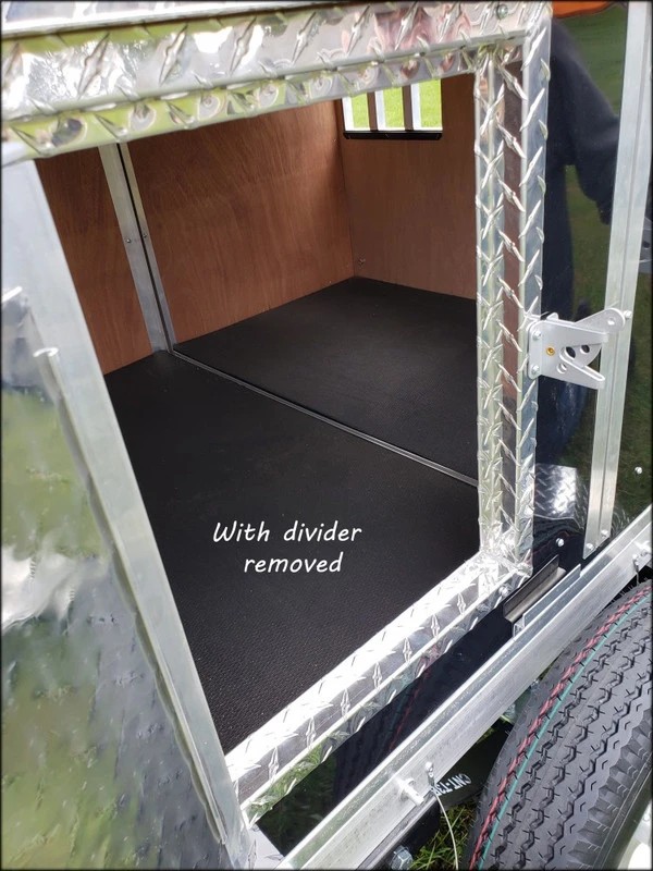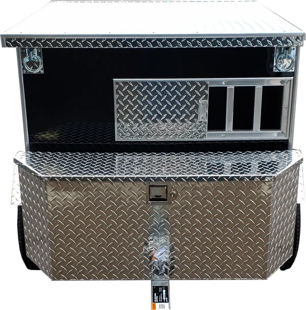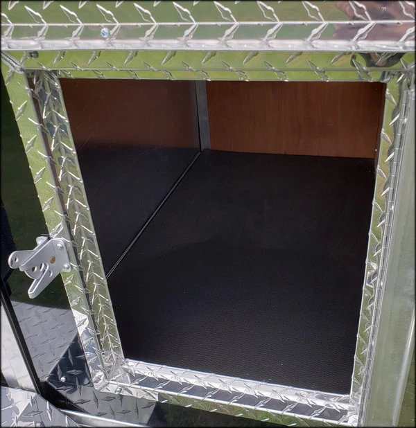 This trailer has insulated and noise reduction interior & each compartment has a rubber mat for extra comfort for your dog. The center divider is removable to make this 2-dog kennel into 1 large compartment. To take out center divider simply pull the lock pins, remove the fender, unscrew the security thumb screw above the handle and pull out divider. Both kennel compartments have large slider vents to provide great cross ventilation & maximum airflow. There are no slots or small holes like other trailers which will starve airflow to the dog. There are four o-rings on the trailer exterior for tying out your dogs while parked. On the front of the trailer there is an weather tight lockable compartment that gives you even more storage while traveling.