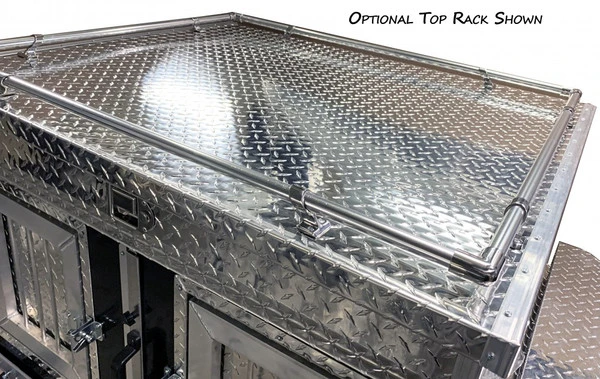 The doors are welded aluminum jail-house style doors made from 1” x 2” aluminum extrusion and round rod. They are tall doors, making easy access for the dogs jumping in and out of the trailer. The doors have removable aluminum door covers. Door size is approx 13”W x 17”T.