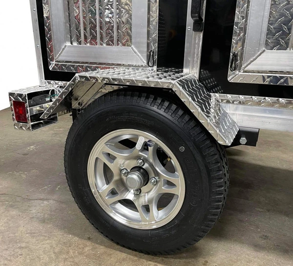 Specifications: Black aluminum exterior color w/ Diamond plate Aluminum trim. Double wall construction, .030 gauge smooth aluminum outer skin, ¾” foam board insulation, lauan interior sheathing, controlled air flow slider vents on both sides, aluminum doors, ½” plywood floors, weatherized hinged lids, pneumatic lid lifts. Tires are 5.30 x 12.