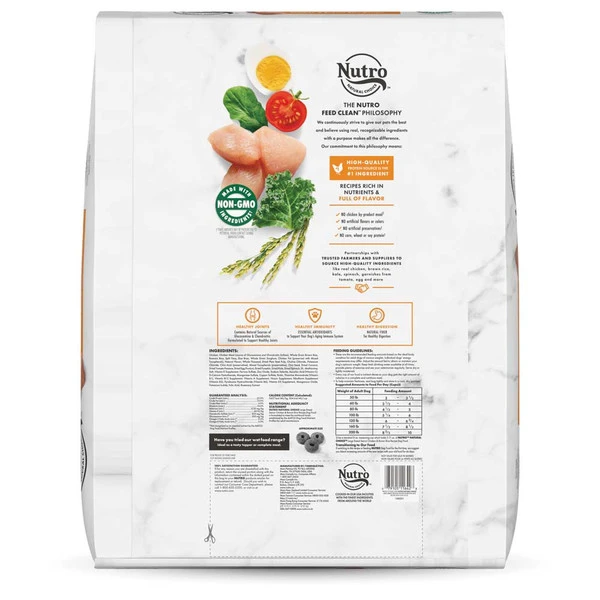 Your dog will do a happy dance when you fill their dog food bowl with NUTRO WHOLESOME ESSENTIALS Large Breed Senior Dry Dog Food. This recipe starts with farm-raised chicken as the first ingredient, a high-quality protein source dogs love. With a crunchy kibble, this tasty dry dog food contains natural sources of glucosamine and chondroitin, features essential antioxidants to support your dog’s aging immune system, and is formulated to support healthy joints. This NUTRO recipe is made with non-GMO ingredients* and has no chicken by-product meal, corn, wheat, or soy protein, and no artificial flavors, colors, or preservatives. Plus, it’s cooked in our USA facilities with the finest ingredients from around the world for your large breed senior dog to enjoy. Give your dog NUTRO WHOLESOME ESSENTIALS recipes with the NUTRO FEED CLEAN logo every day for ultimate tail wags. * Trace amounts of genetically modified material may be present due to potential cross-contact during manufacturing.