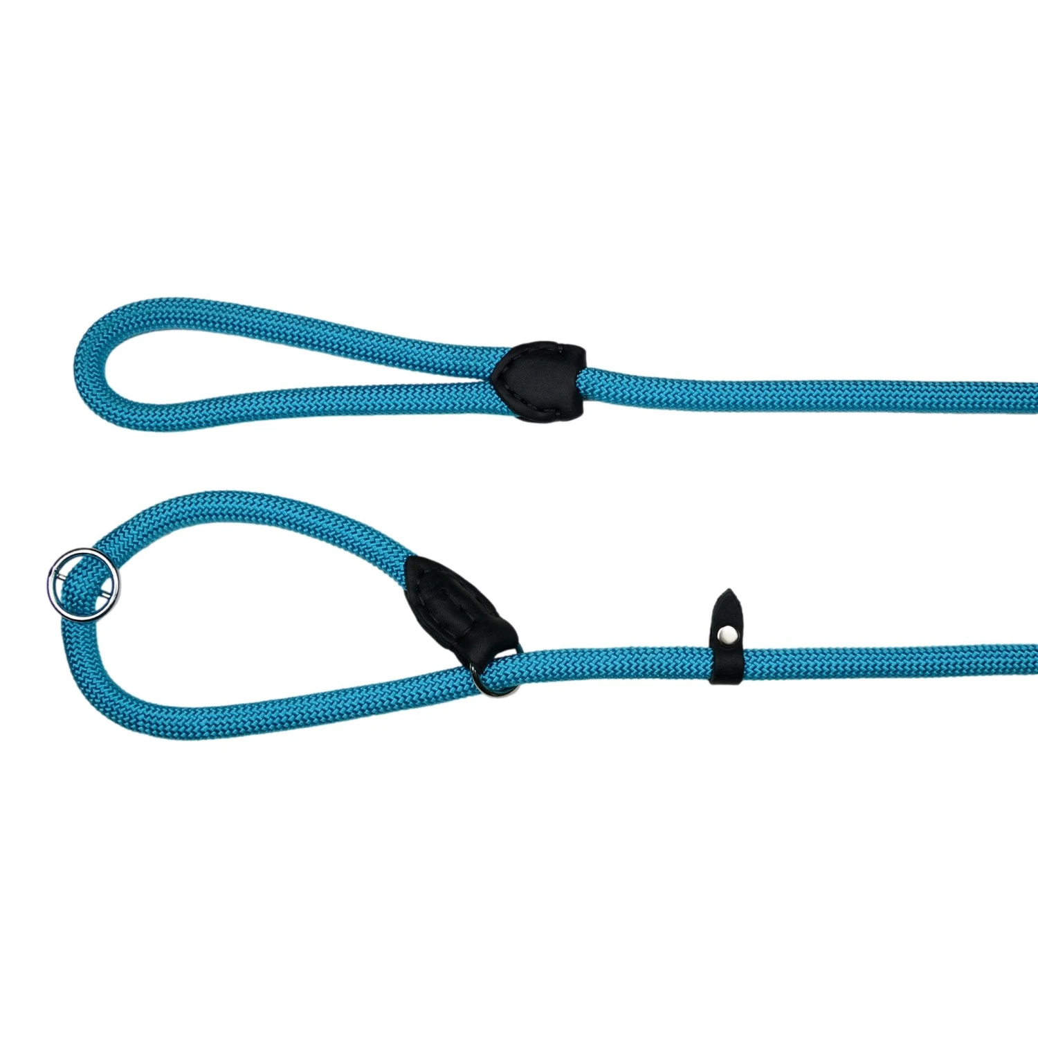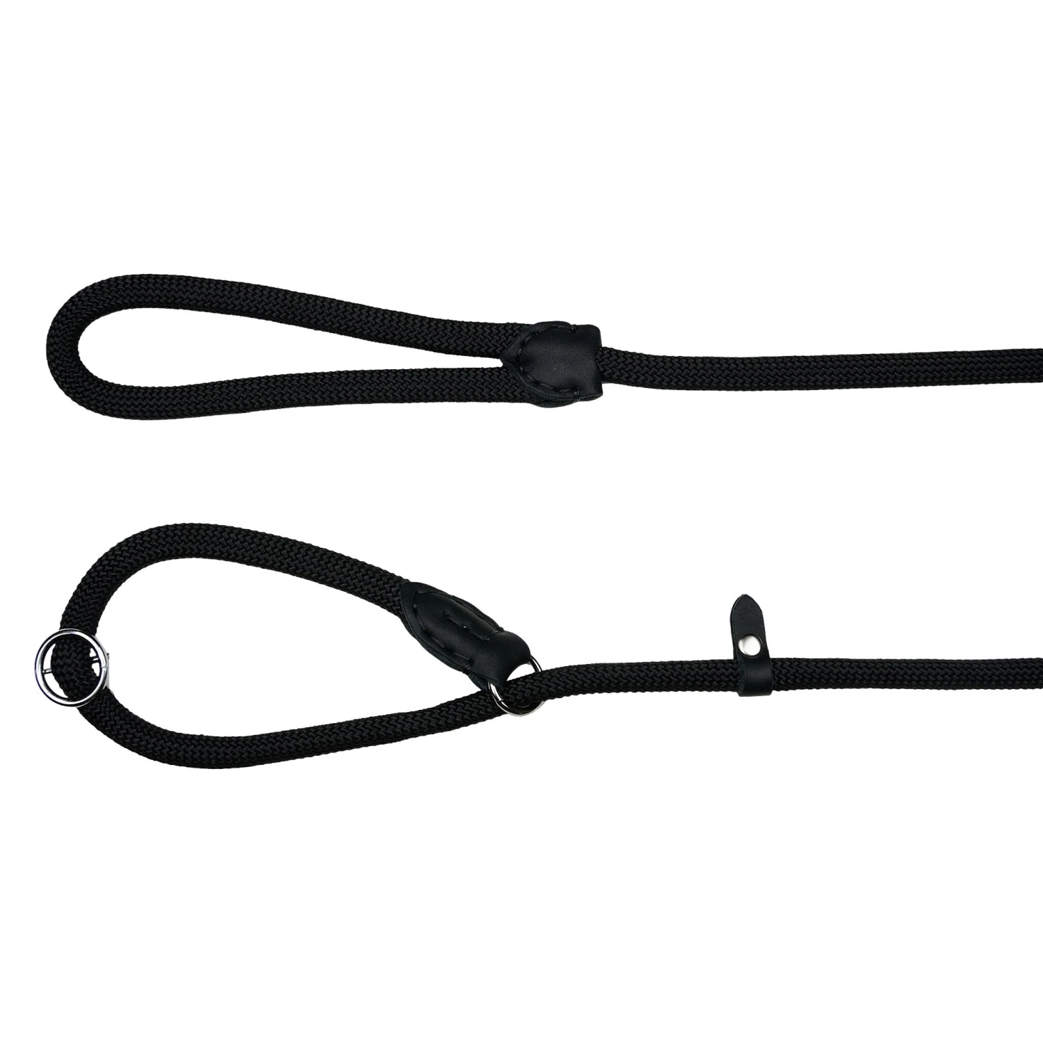 This flexible nylon slip leash is the perfect pick up and go leash. 5′ or 7′ long when adjusted to the smallest size and 1/2″ in diameter, this leash is suitable for everyday use. The outer nylon is soft and supple in your hands and the reinforced Polyamide core makes it extra strong. This leash features a metal ring and leather clip to limit the minimum and maximum range for the slip end to ensure an ideal fit for your dog. Weather resistant this leash wipes clean easily.