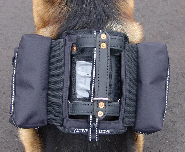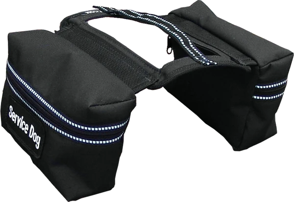 The Saddle Bag Packs are designed to fit on our Heavy Duty Mobility Harness. The packs are made of 1000 denier, black nylon/urethane coated fabric. The interior of the bags can be easily wiped clean. The saddle bags have heavy, durable zippers. Reflective webbing, on the sides of the bags, is an added safety feature. One of the bags has a patch (regular patch, not specialty patch) of your choice, and the other bag has a clear vinyl pocket with Hook and Loop closure for an ID.