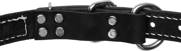Constructed of thick, black latigo leather, 1 inch wide. It is re-inforced with white stitching. The D-ring, loop and roller buckle are nickel plated steel. Latigo leather is a durable, flexible, softer leather and it breaks in faster. It is dyed solid all the way through, so it will not fade. Because of the conditioners that are infused with oils during the process latigo leather is almost waterproof. It will not dry out like most harness leather. It can be easily cleaned and oiled after use. Made in the USA, our Wisconsin factory.