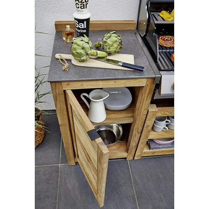 Mit den Zoe Teak Grillküchen-Modulen kann eine individuelle Outdoor-Küche zusammengestellt werden, welche durch verschiedene Kombinationen ideal an die Gegebenheiten auf der eigenen Terrasse oder im heimischen Garten angepasst werden kann.